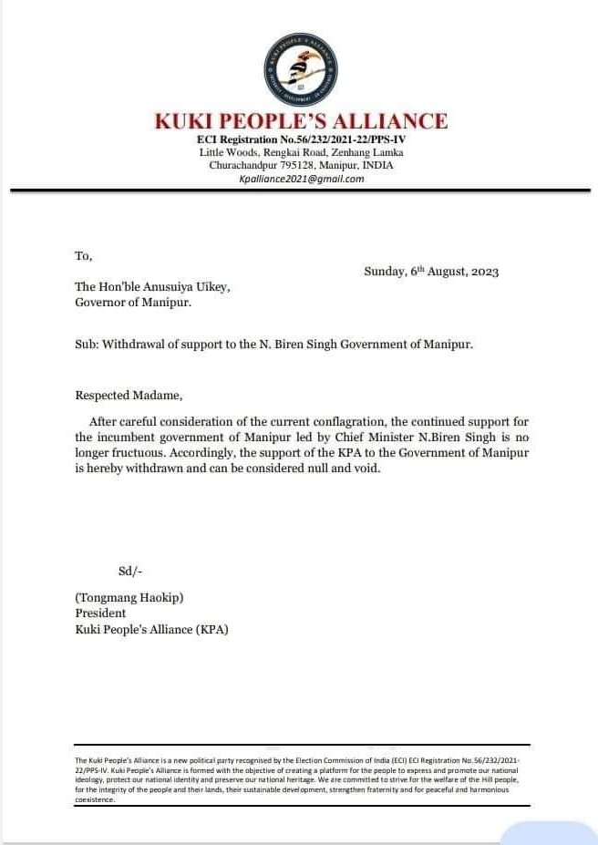 केपीए प्रमुख टोंगमांग हाओकिप ने पत्र में कहा कि मौजूदा संघर्ष पर लंबे समय तक नजर डालने के बाद, मुख्यमंत्री एन बीरेन सिंह के नेतृत्व वाली वर्तमान मणिपुर सरकार को समर्थन जारी रखने का कोई मतलब नहीं है. केपीए मणिपुर सरकार से अपना समर्थन वापस ले रही है.