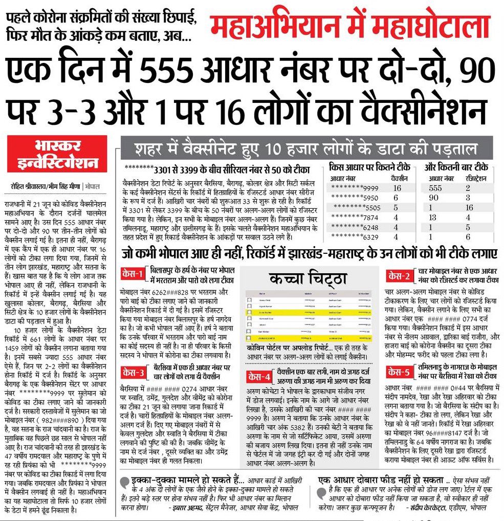 मध्यप्रदेश राज्य में 21 जून के टीकाकरण को लेकर भास्कर समाचार पत्र की एक जांच में पता चला है की महाअभियान में महा घोटाला हुआ है ! भास्कर की रिपोर्ट के अनुसार 1 दिन में 555 आधार नंबर पर 2-2 लोगो का टीकाकरण 90 आधार नंबर पर 3-3 लोगो का टीकाकरण और 1 आधार नंबर पर 16 लोगो का टीकाकरण किया गया ! भास्कर की रिपोर्ट में यह भी खुलासा किया गया है कि सतना के राजचांद वानी जो पिछले 6 साल से भोपाल ही नहीं आए उनकाभोपाल में टीकाकरण हुआ है !