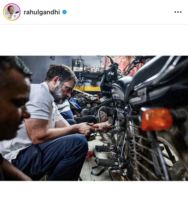 दरअसल, कांग्रेस नेता राहुल गांधी मंगलवार को दिल्ली के करोल बाग में बाइक और साइकिल मैकेनिकों से मुलाकात की। इस दौरान कांग्रेस नेता एक दुकान में मिस्त्रियों के साथ जमीन पर बैठ गए और बाइक ठीक करने लगे। दोपहिया वाहन को ठीक करने के लिए पेचकस उठाते समय उन्हें व्यापारियों और बाइक मैकेनिकों से बात करते देखा गया।